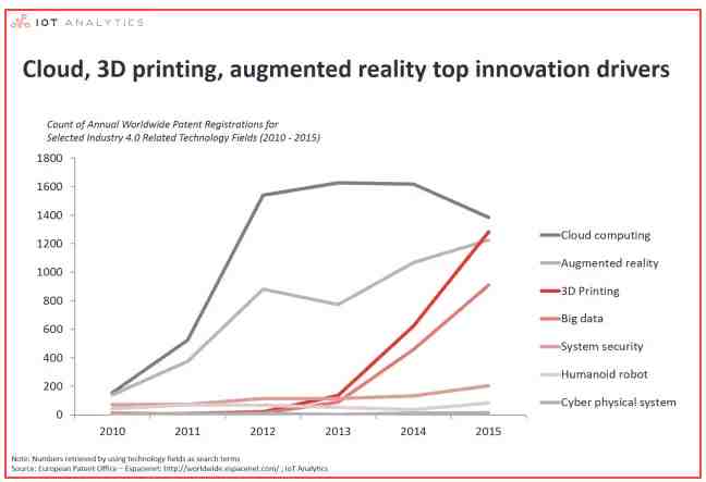 基于10的增長因數(shù),3D打印/增材制造(AM)或將成為工業(yè)技術的未來趨勢。為了在未來1年或者2年內(nèi)成為"工業(yè)4.0"相關專利的一顆流星,3D打印緊跟增強現(xiàn)實和云計算的腳步。特別有趣的是,3D打印不是一種特定的網(wǎng)絡技術,因為它有資格作為一種新的生產(chǎn)方式,因此是硬件基礎。